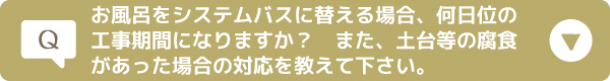 工事内容によって工事期間が違いますが、ちょっとした修理や設備の交換であれば半日程で済む場合もございます。また、屋根・外壁の張替えで14日間、お風呂の入れ替えで6日間、クロスの張替(30坪の家全室)で5日間ぐらいが目安となります。 打合せの時におよその工事期間をお伝えしますので、ご家族の予定や事情があればご相談下さい。